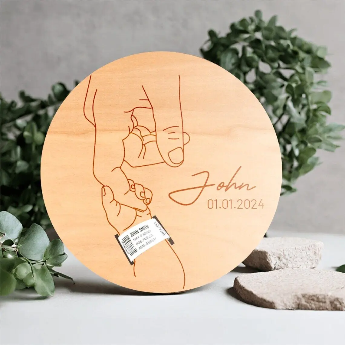 Ein liebevolles Andenken an die ersten Tage deines Babys: Dieser handgefertigte runde Holzhalter kombiniert Stil und Funktion. Er dient als personalisiertes Namensschild und praktischer Halter für das Krankenhaus-Armband – perfekt für Fotos und bleibende Erinnerungen.